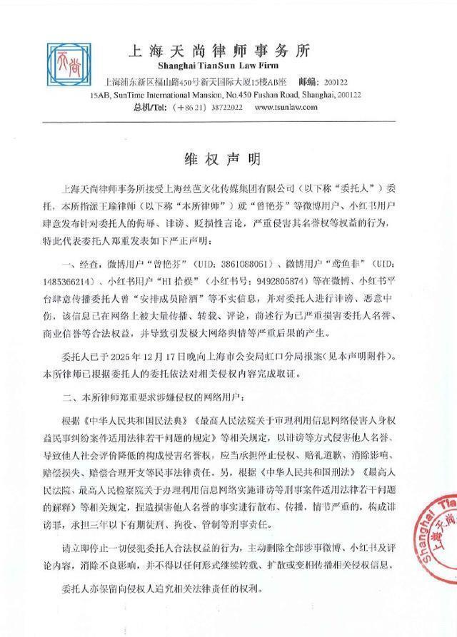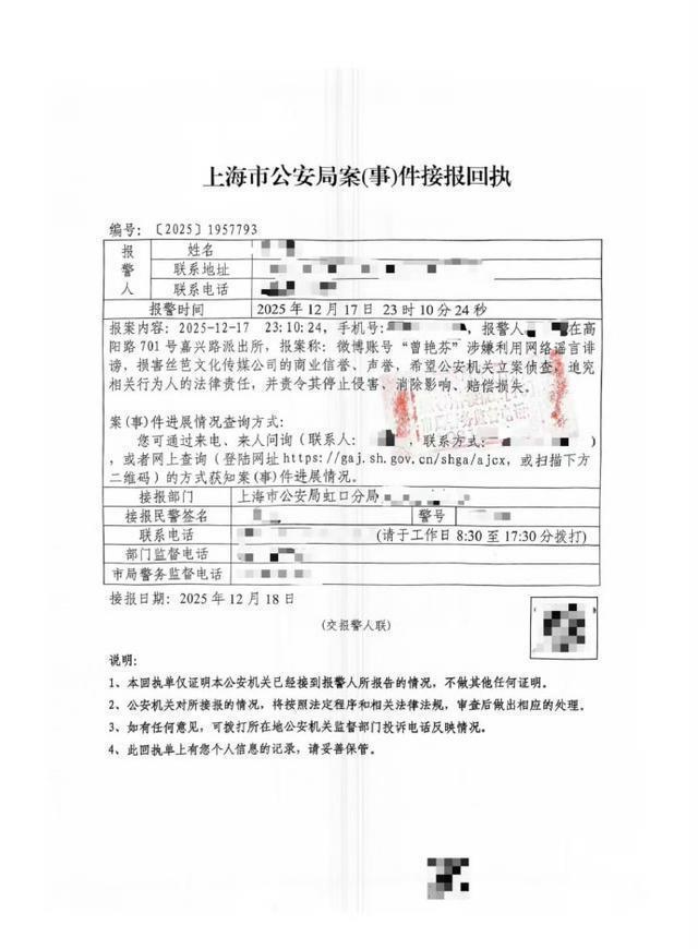 丝芭传媒这次可谓“重拳出击”,委托律师事务所发布声明,直指曾艳芬在社交平台散布“公司安排成员陪投资方喝酒”等言论构成诽谤,并晒出了接报回执(编号:〔2025〕1957793)。但眼尖的网友立刻发现,回执上明晃晃写着“仅证明接警,不做其他证明”。声明中援引《刑法》诽谤罪条款,摆出追究刑责(最高三年)的架势,要求删帖道歉,试图用法律威严震慑对手。